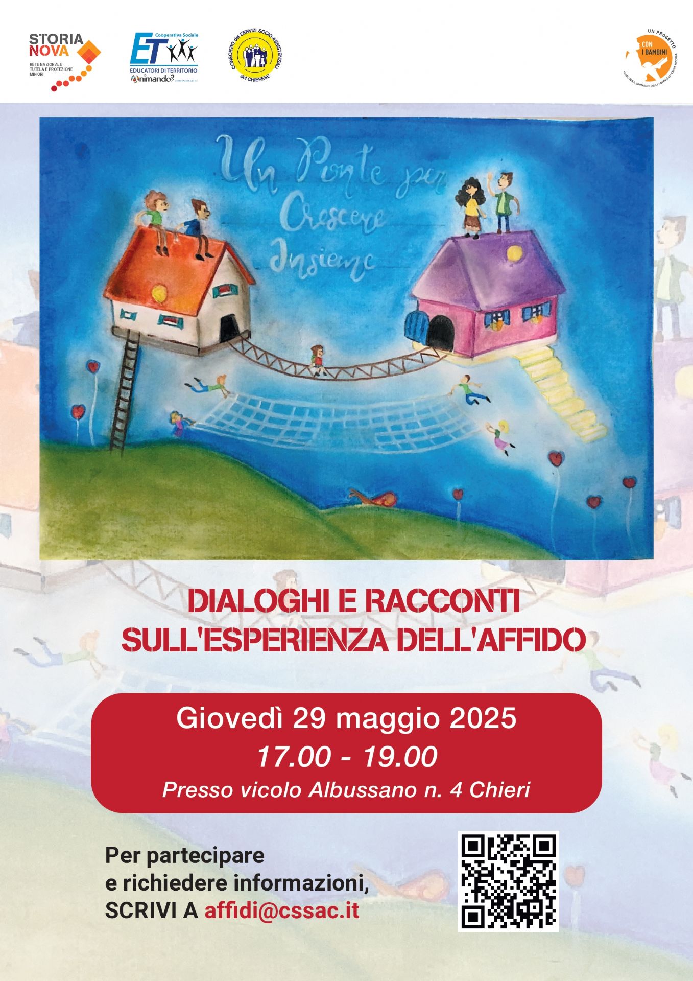 Il Consorzio dei Servizi Socio Assistenziali del Chierese organizza l'incontro "Un ponte per crescere insieme - dialoghi e racconti sull'esperienza dell'affido" con lo scopo di sensibilizzare le persone rispetto al tema dell'affido familiare. L'incontro si terrà giovedì 29 maggio dalle ore 17.00 alle ore 19.00 presso gli spazi del Consorzio di Vicolo Albussano n. 4 a Chieri.