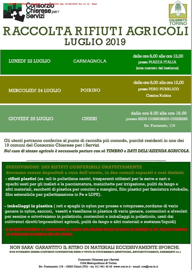 Nel mese di luglio viene organizzata dal Consorzio Chierese per i Servizi con la collaborazione delle Associazioni di categoria la raccolta gratuita dei rifiuti agricoli.