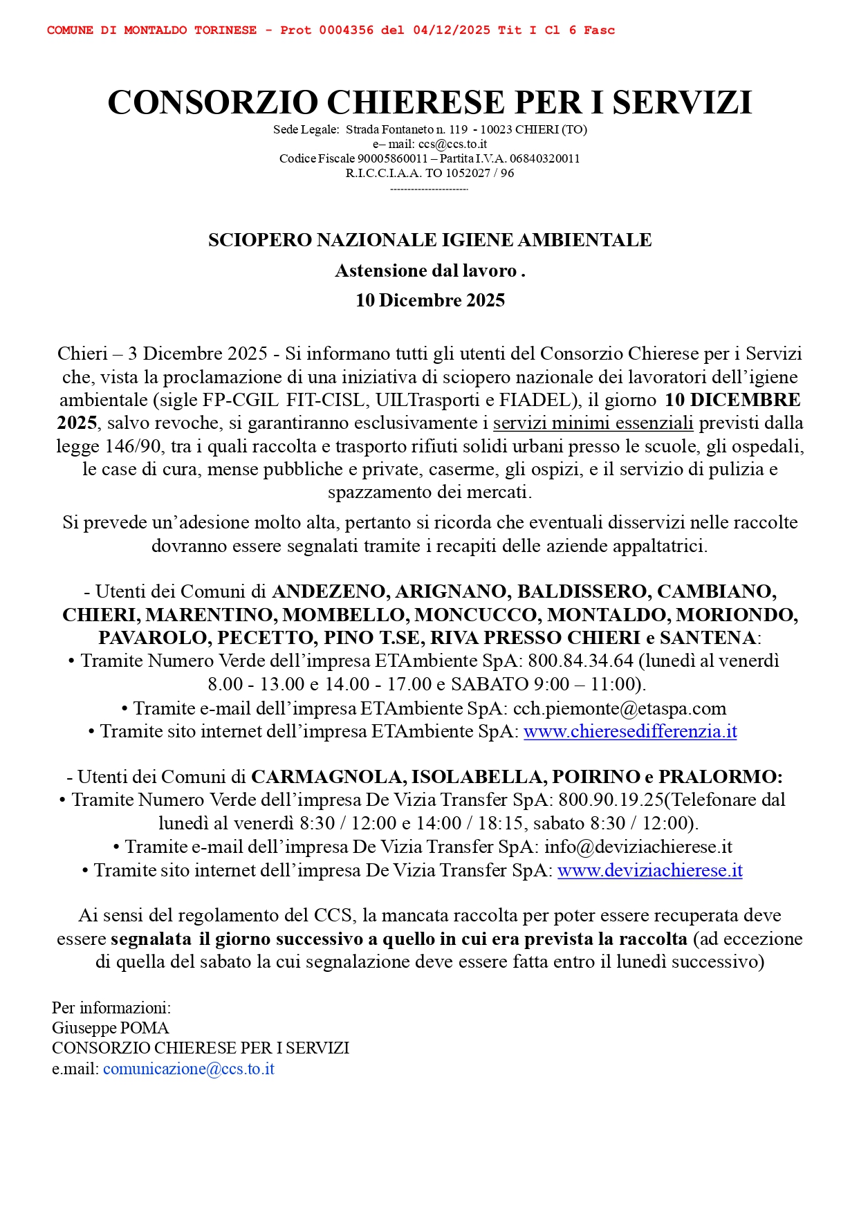 Si informano tutti gli utenti del Consorzio Chierese per i Servizi che, vista la proclamazione di una iniziativa di sciopero nazionale dei lavoratori dell’igiene ambientale (sigle FP-CGIL FIT-CISL, UILTrasporti e FIADEL), il giorno 10 DICEMBRE 2025, salvo revoche, si garantiranno esclusivamente i servizi minimi essenziali previsti dalla legge 146/90, tra i quali raccolta e trasporto rifiuti solidi urbani presso le scuole, gli ospedali, le case di cura, mense pubbliche e private, caserme, gli ospizi, e il servizio di pulizia e spazzamento dei mercati.