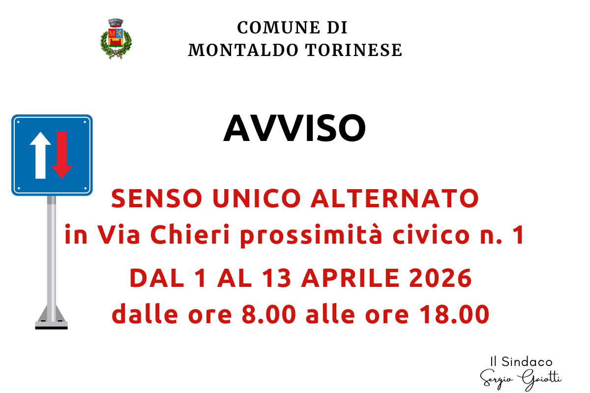 Viene istituito il senso unico alternato in Via Chieri in prossimità del civico n. 1, dalle ore 8.00 alle ore 18.00 per il periodo dal 1 al 13 aprile 2026.
