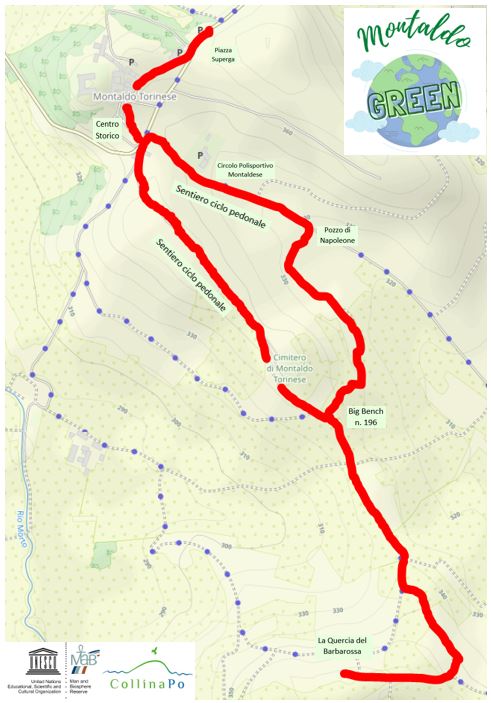 Il sentiero ciclo pedonale parte da piazza Superga in prossimità del municipio e del centro storico; la più antica memoria di Montaldo risale al 26 gennaio 1159 con la citazione del paese nel diploma di Federico Barbarossa, che assegnò in feudo la “Curtem de monte alto” al Vescovo di Torino, Carlo I (1147-1162).