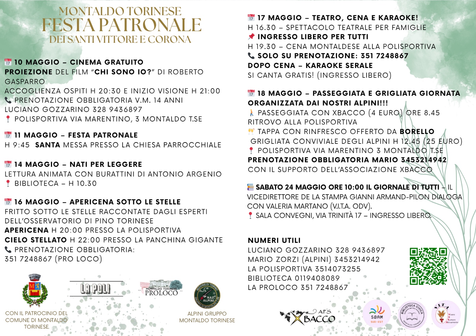 A Montaldo Torinese una serie di eventi organizzati per la festa patronale dei Santi Vittore e Corona dal 10 maggio al 24 maggio 2025. In allegato la locandina con il programma completo.