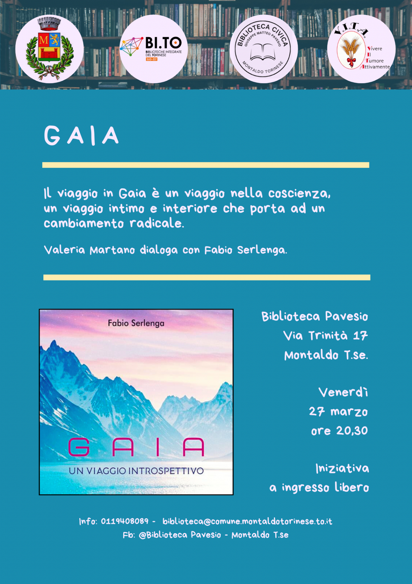 Venerdì 27 marzo alle h. 20:30 Valeria Martano dialoga con l'autore Fabio Serlenga. Il viaggio in Gaia è un viaggio nella coscienza, un viaggio intimo e interiore che porta ad un cambiamento radicale.