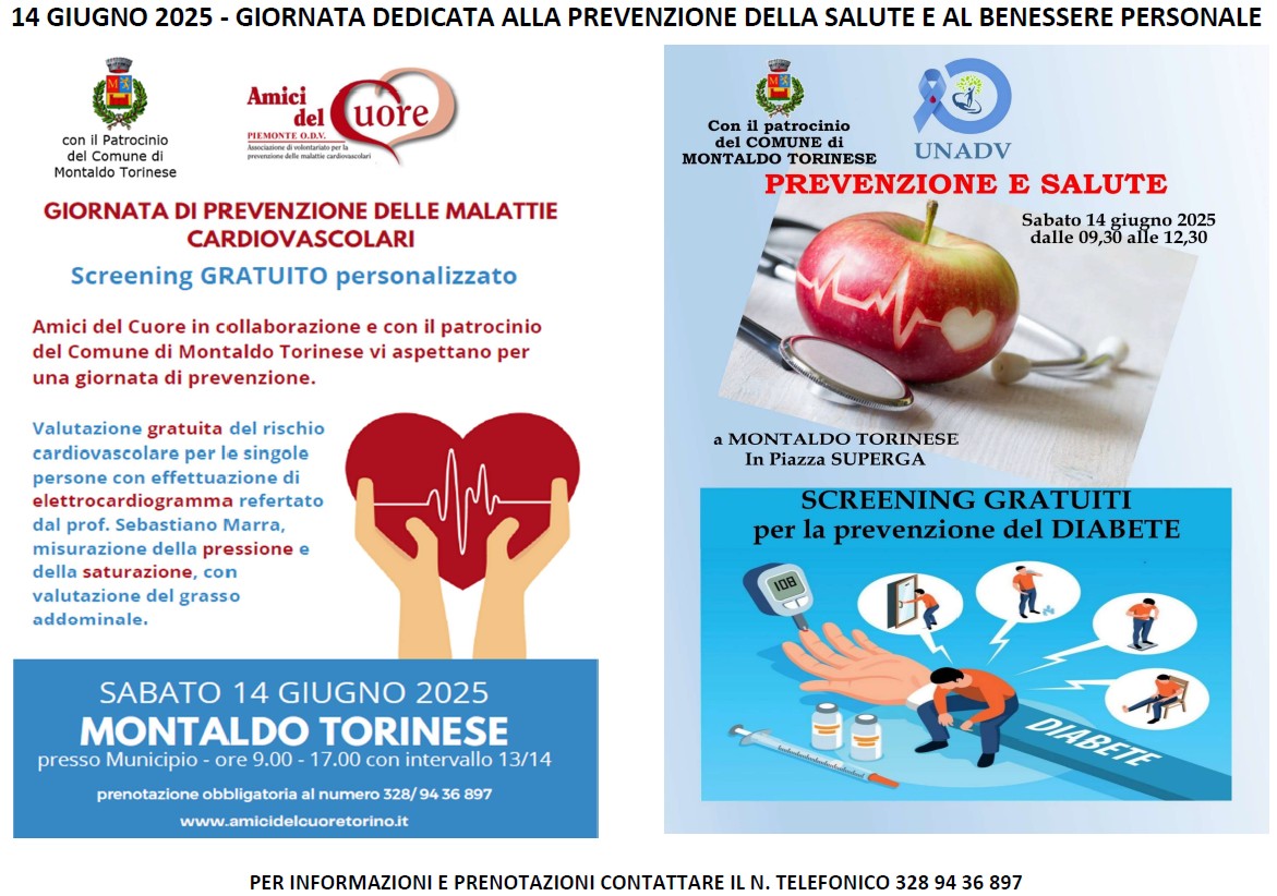 Torna la Giornata dedicata alla Prevenzione della Salute e al Benessere Personale 2025. Lo screening cardiovascolare è su prenotazione e con prelazione ai cittadini montaldesi; lo screening del diabete sarà a accesso libero nella mattinata di sabato 14 giugno. Come Amministrazione Civica riteniamo che sia un appuntamento utile a tutta la nostra comunità.