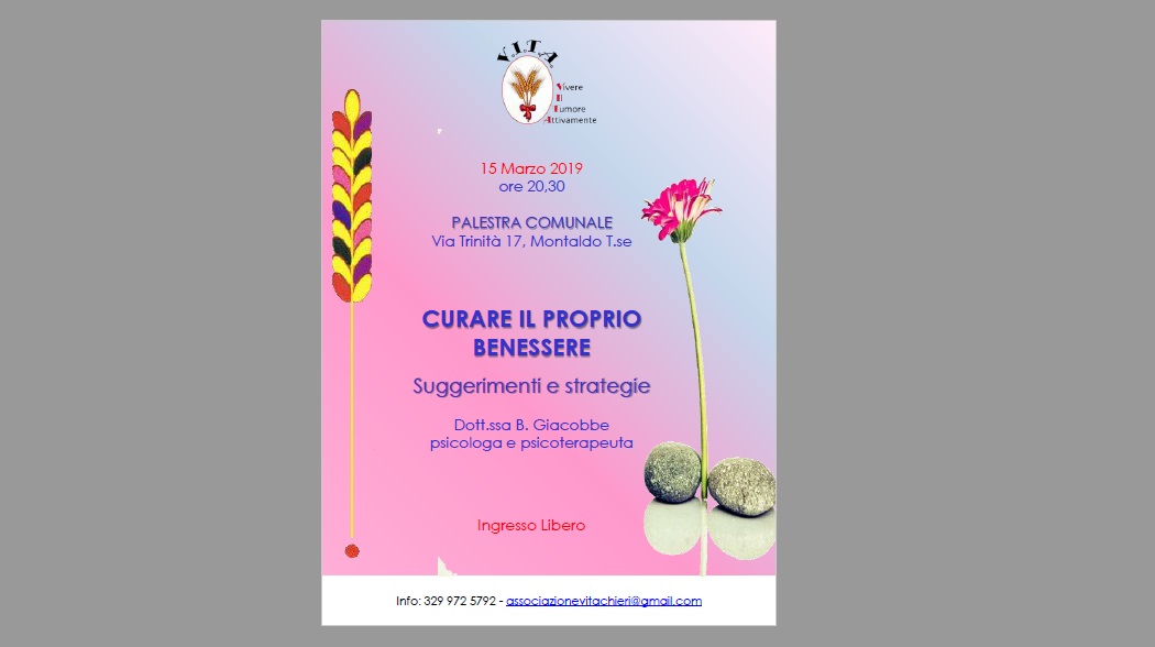 Venerdì 15 marzo alle ore 20,30 nella palestra comunale di Montaldo (Municipio) si terrà un incontro dal titolo “ Curare il proprio benessere. Suggerimenti e strategie”.