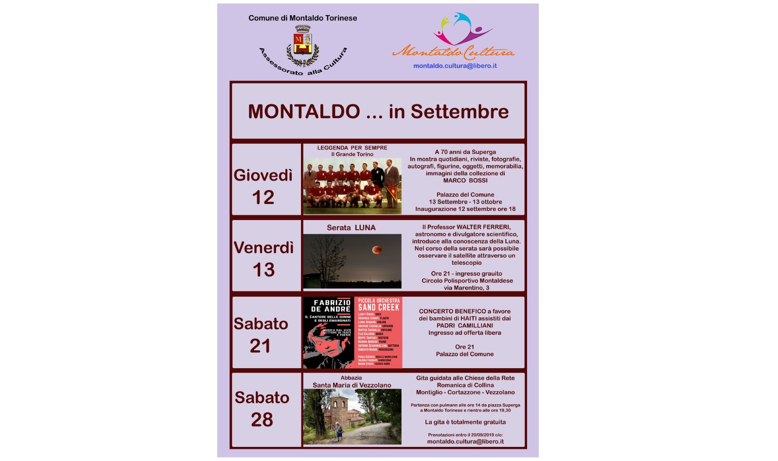 Nel mese di SETTEMBRE, Montaldo Cultura, in collaborazione con l'Assessorato alla Cultura del Comune di Montaldo Torinese, ha organizzato i seguenti eventi: