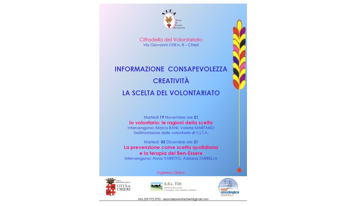 Illustreranno la loro disciplina e la loro esperienza quattro volontarie dell’associazione V.I.T.A.: Valeria Giulini, fisioterapista; Silvia Martini, esperta di biodanza; Luciana Flesia ed Elena Brunetti per lo shiatsu, il rilassamento e la meditazione.