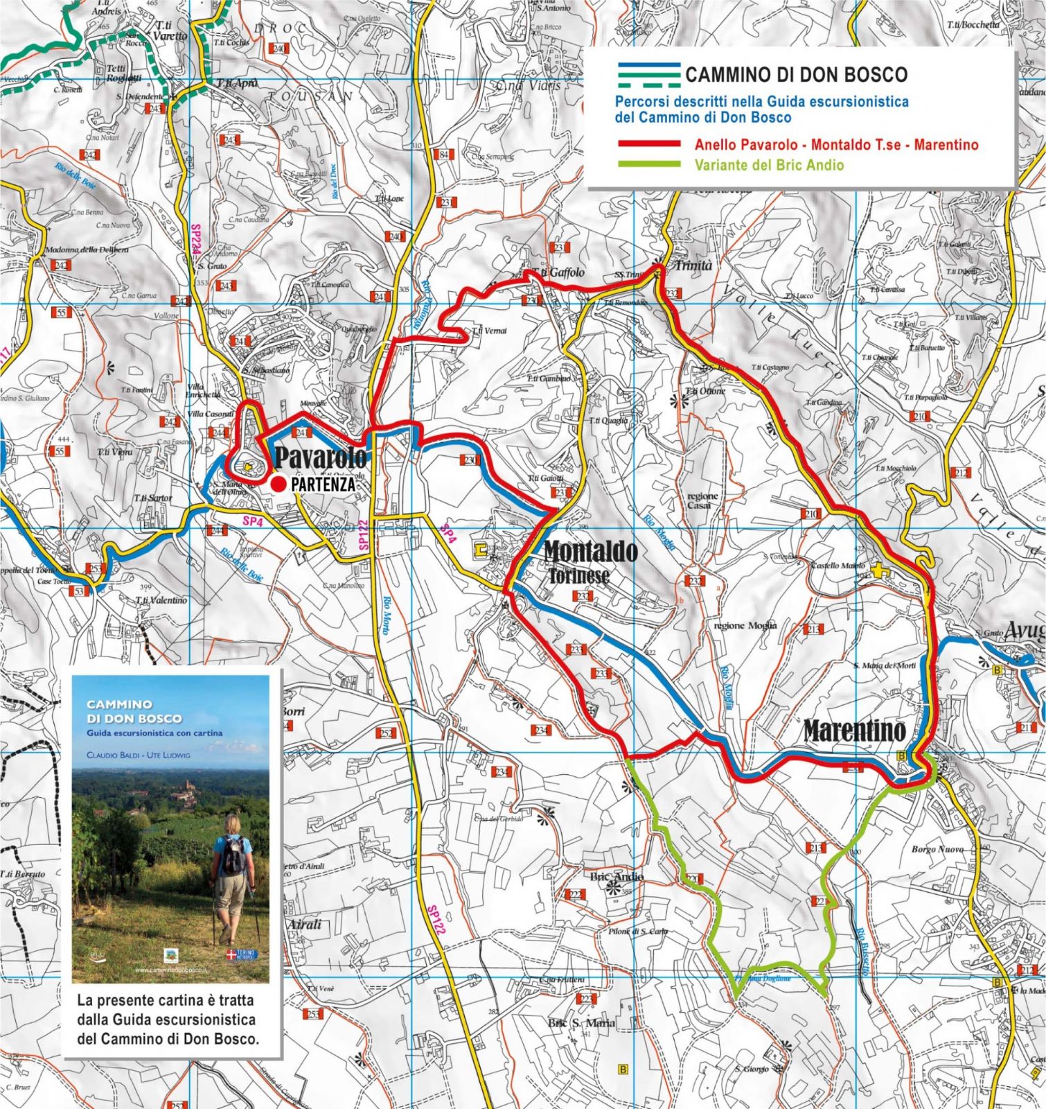 Partendo a Pavarolo dal parcheggio di via Maestra adiacente alla scalinata della Torre seguire il Cammino Don Bosco:tenere la sin, svoltare a sin al primo incrocio, per scendere a dx (percorsi 300 m dalla Torre) lungo Via Generale Zavattaro. Raggiunta la SP122, girare a sin -prestando la massima attenzione al traffico- per attraversarla dopo circa 50 m in prossimità di un’area artigianale e proseguire poi quasi subito dopo a dx nella strada che la attraversa -seguendola per circa 150 m- svoltando quindi a sin nei pressi dell’ultimo capannone. Lasciando la struttura sulla sin, continuare per circa 700 m su uno sterrato che -descrivendo un semicerchio- gradualmente sale a Montaldo T.se. Giunti sull’asfalto, svoltare a destra verso piazza Superga (casetta acqua SMAT), proseguendo diritto per circa 300 m fino ad incrociare -ignorandola- a sin la strada per Marentino. Qui continuare diritto attraversando Piazza Fornace in direzione cimitero sul sentiero 233. Percorsi 350 m si può ammirare un esemplare monumentale di Sophora nei pressi di un pilone votivo. Percorsi altri 300 m tenere la dx su sterrato in discesa in corrispondenza del cimitero. Ignorare le successive due deviazioni a dx e sin, per svoltare a sin dopo 460 m in prossimità di un pilone votivo (1), per raggiungere dopo 400 m la strada Montaldo-Marentino. Svoltare a dx e proseguire sul fondovalle per 1.200 m, oltrepassando il campo sportivo per salire a Marentino lungo la strada del Pozzetto, entrando in paese in corrispondenza di Casa Zuccala. Qui (casetta acqua SMAT) svoltare a sinistra, per proseguire diritto per 400 m sulla SP98 -superando l’Apiario sperimentale- e raggiungendo la Chiesa di S. Maria dei Morti. Continuare ancora diritto per 200 m, quindi svoltare a sin verso Tetti Ottone in corrispondenza di una croce di ferro. Al successivo trivio proseguire a dx per 1,55 km sul sentiero 210, ignorare la deviazione a sin per Tetti Ottone e proseguire diritto. Percorsi 150 m ignorare ancora la deviazione a sin (sentiero 232 che riporta a Montaldo T.se) per continuare diritto e giungere dopo 400 m a Tetti Trinità di Montaldo T.se; qui tenere la sin su asfalto per 180 m e -superata la piazzetta- imboccare a dx il sentiero 230 in direzione Tetti Gaffolo. Proseguire diritto per 250 m ignorando la prima deviazione a dx, quindi girare a dx accanto ad un’abitazione. Percorsi 230 m e giunti in Tetti Gaffolo tenere la dx su sentiero 230. Dopo un primo tratto in asfalto il percorso inerbito conduce in 780 m a Tetti Vernai. Qui tenere la dx e poi la sin 300 m dopo, proseguendo per 430 m fino all’area artigianale di Montaldo. Svoltare a dx, per incrociare dopo 150 m la SP122 e svoltare a sin -prestando la massima attenzione al traffico- e girare a dx dopo 50 m per salire su Via Generale Zavattaro e quindi svoltare a dx sulla SP224. Percorsi 220 m (casetta acqua SMAT) inoltrarsi a dx in via Rubino proseguendo diritto (ignorare dopo 200 m la deviazione a dx su Cammino Don Bosco verso Bardassano) su un bel percorso pedonale che conduce al punto di partenza.
