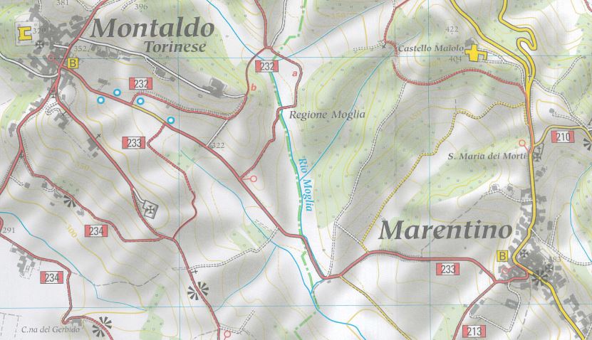 A fianco della carreggiata asfaltata si trova il pozzo scavato, secondo la tradizione, dalle truppe napoleoniche nel luglio del 1800, quando, durante la battaglia di Marengo, eressero proprio in questo sito un accampamento, in quanto territorio ricco di acqua. Girando attorno al pozzo sulla destra, si prosegue per la strada asfaltata, arrivando nei pressi del campo sportivo di Marentino; in questo tratto s’incontra sulla sinistra il tratto finale del percorso n. 232 proveniente da Tetti Trinità più avanti, superato il Rio Moglia, una carrareccia che sale a sinistra verso Castel Majolo.